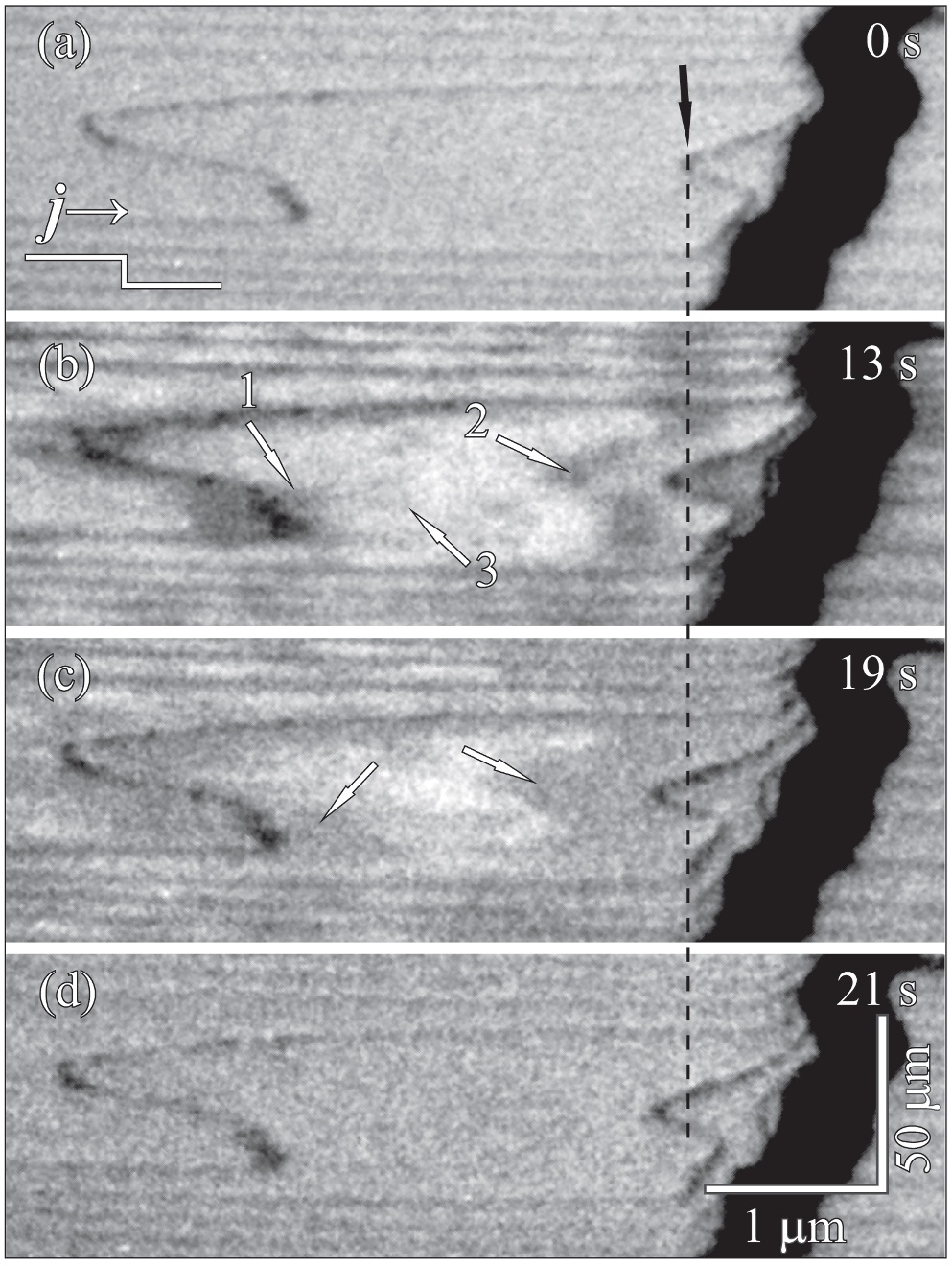 Кадры, снятые в режиме реального времени на сверхвысоковакуумном отражательном микроскопе ИФП СО РАН. На снимках показано, как при осаждении олова меняется поверхность кремния Si(111) при 700 °C. Белыми стрелками отмечены формирующиеся двумерные домены олова, пунктиром — исходное положение атомной ступени, смещающейся в ходе осаждения олова