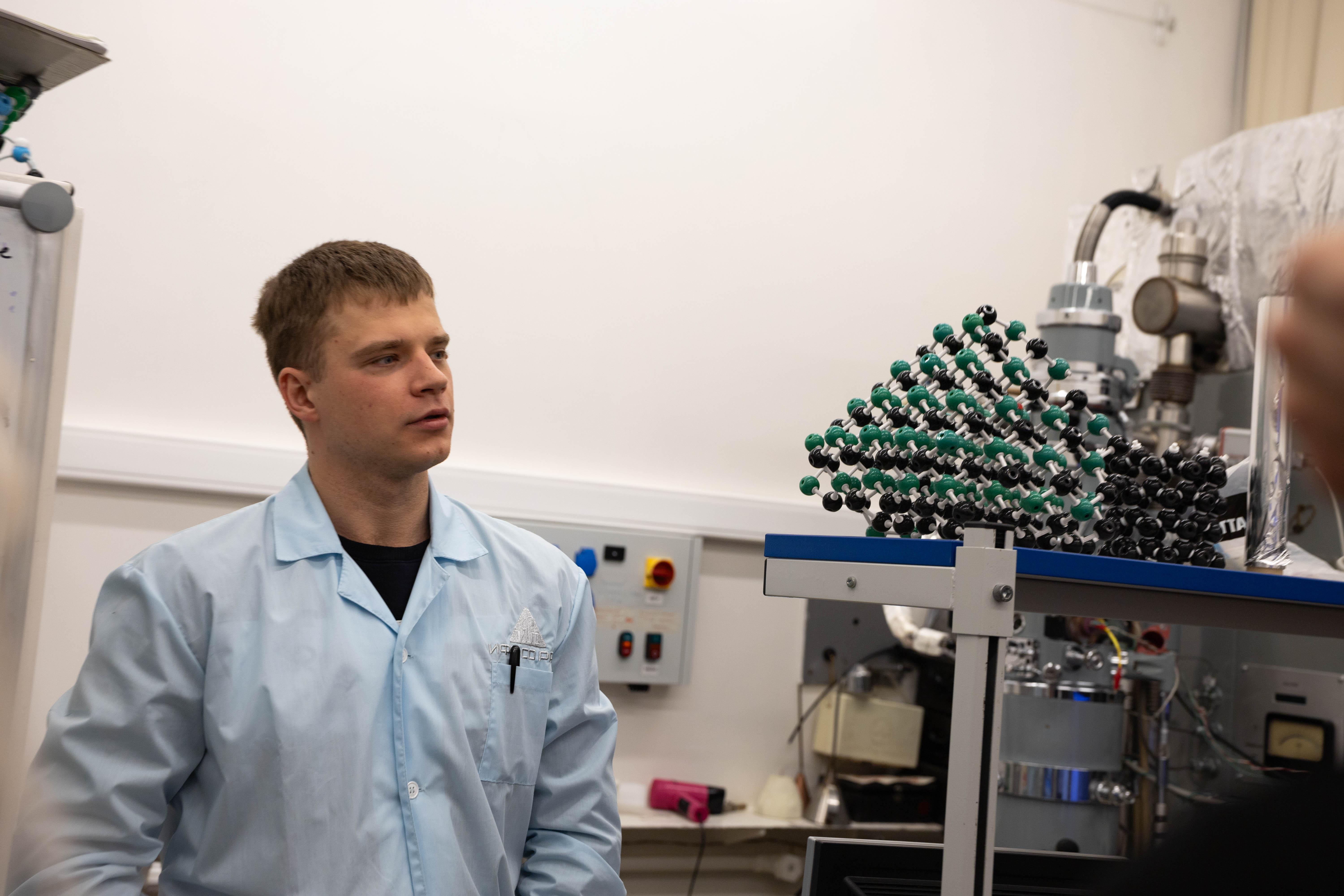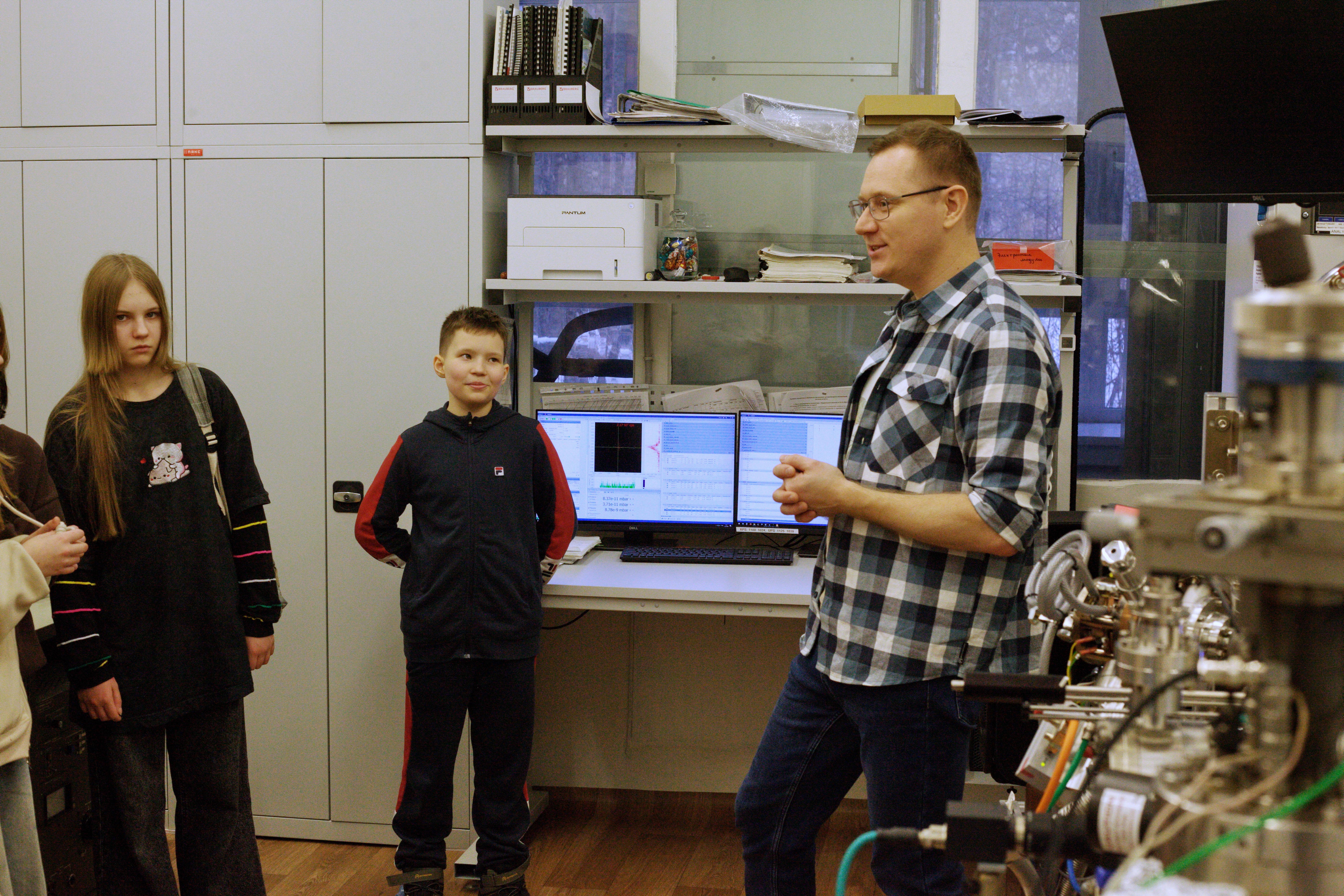 Потом на очищенную, нагретую подложку летят атомы галлия и азота — получается пленочка нитрида галлия. Чтобы в установке соблюдать чистоту, работают откачные насосы и стоит криопанель, заполненная очень холодным жидким азотом — на нее прилипают, “вмораживаются” посторонние, ненужные нам атомы», — объяснил шестиклассникам заведующий молодежной лабораторией аммиачной молекулярно-лучевой эпитаксии GaN гетероструктур на подложках кремния для силовых и СВЧ-транзисторов кандидат физико-математических наук Денис Милахин.