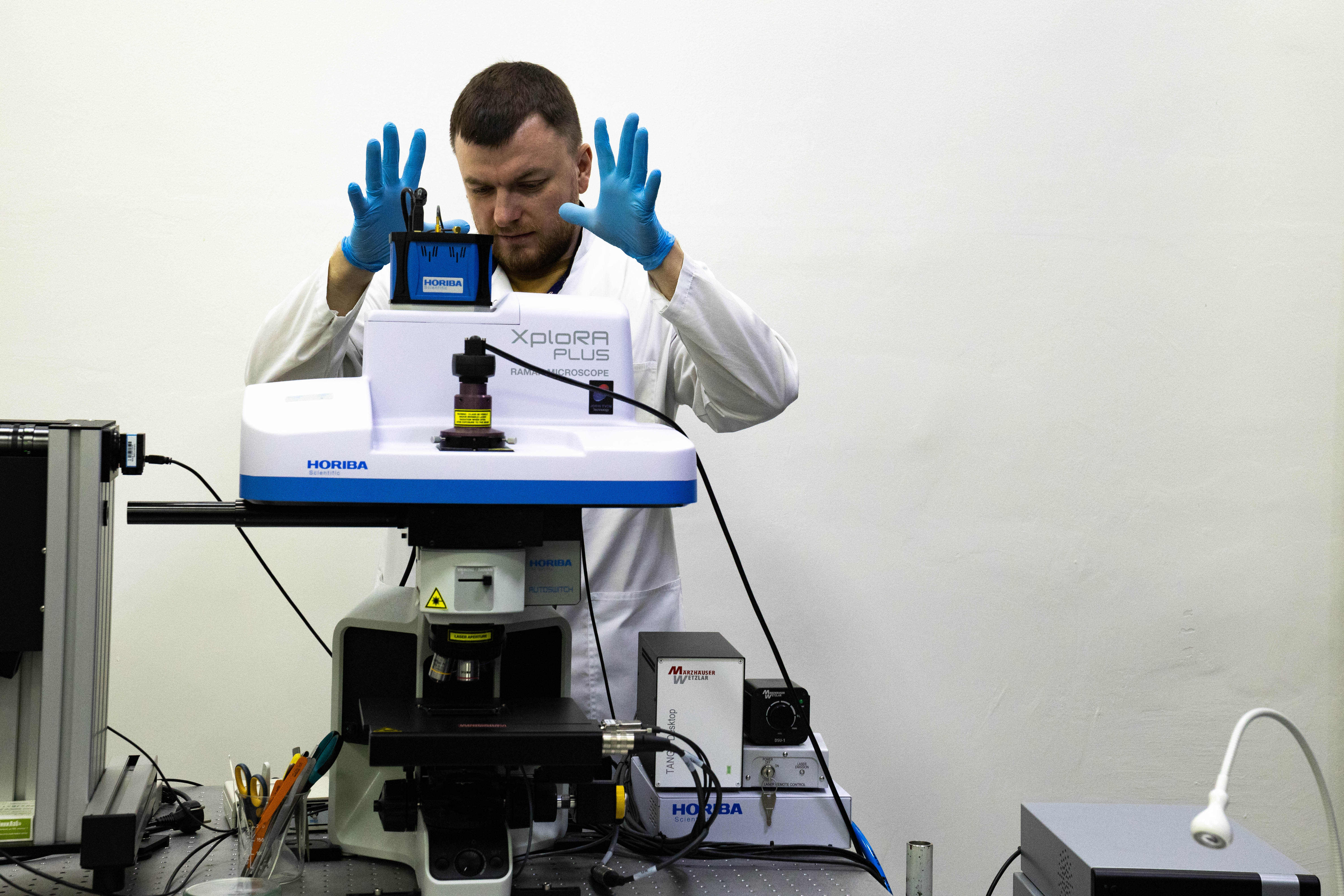 «Не будет лукавством сказать, что это уникальный прибор, по крайней мере, в России. Это спектрометр комбинационного рассеяния света, совмещённый с атомно-силовым микроскопом», — начал свой рассказ старший научный сотрудник молодежной лаборатории ближнепольной оптической спектроскопии и наносенсорики кандидат физико-математических наук Илья Милёхин.