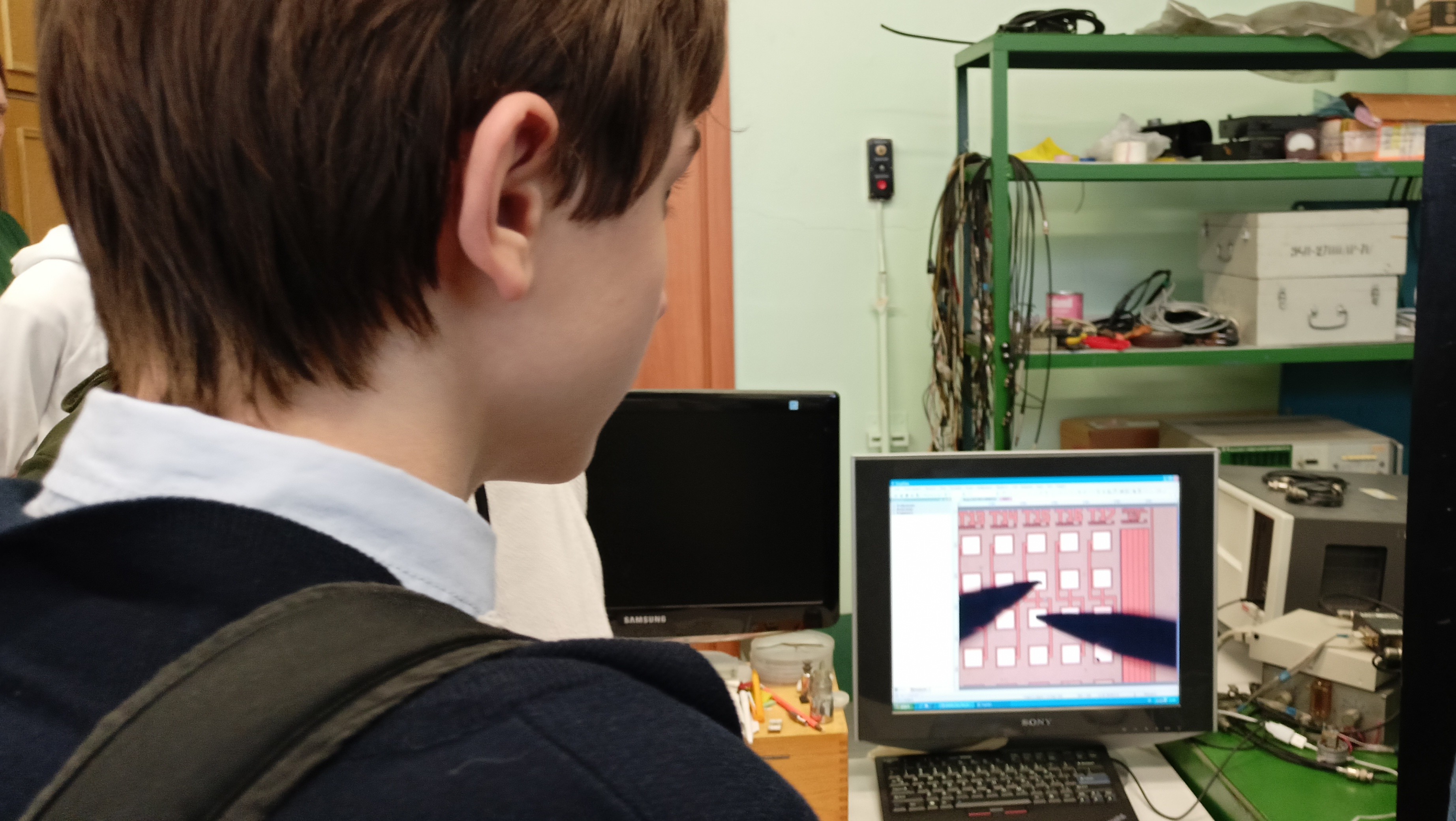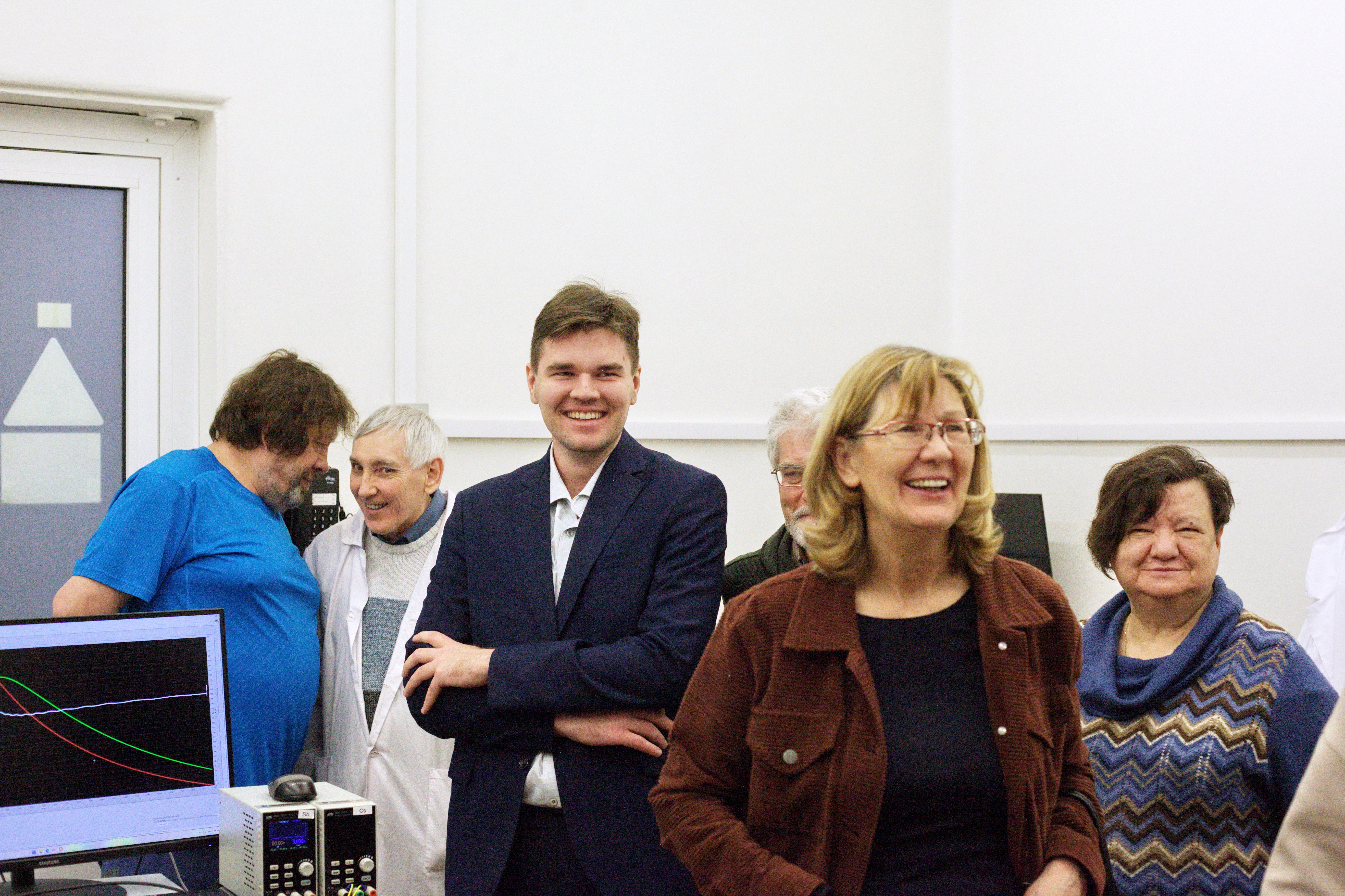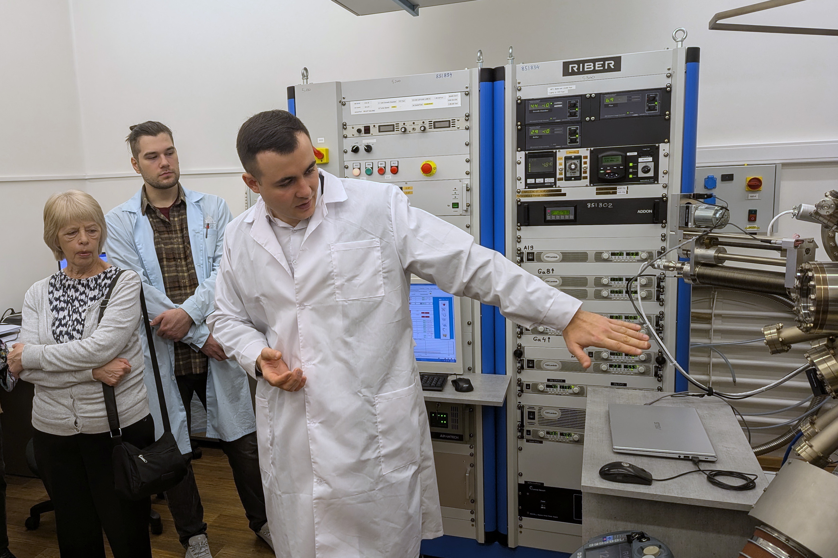 В лаборатории нанодиагностики и нанолитографии экскурсантов ждала встреча со сверхвысоковакуумным отражательным электронным микроскопом. Как пояснил младший научный сотрудник лаборатории Сергей Пономарев, недавно защитивший кандидатскую диссертацию, такой микроскоп — единственный в мире.