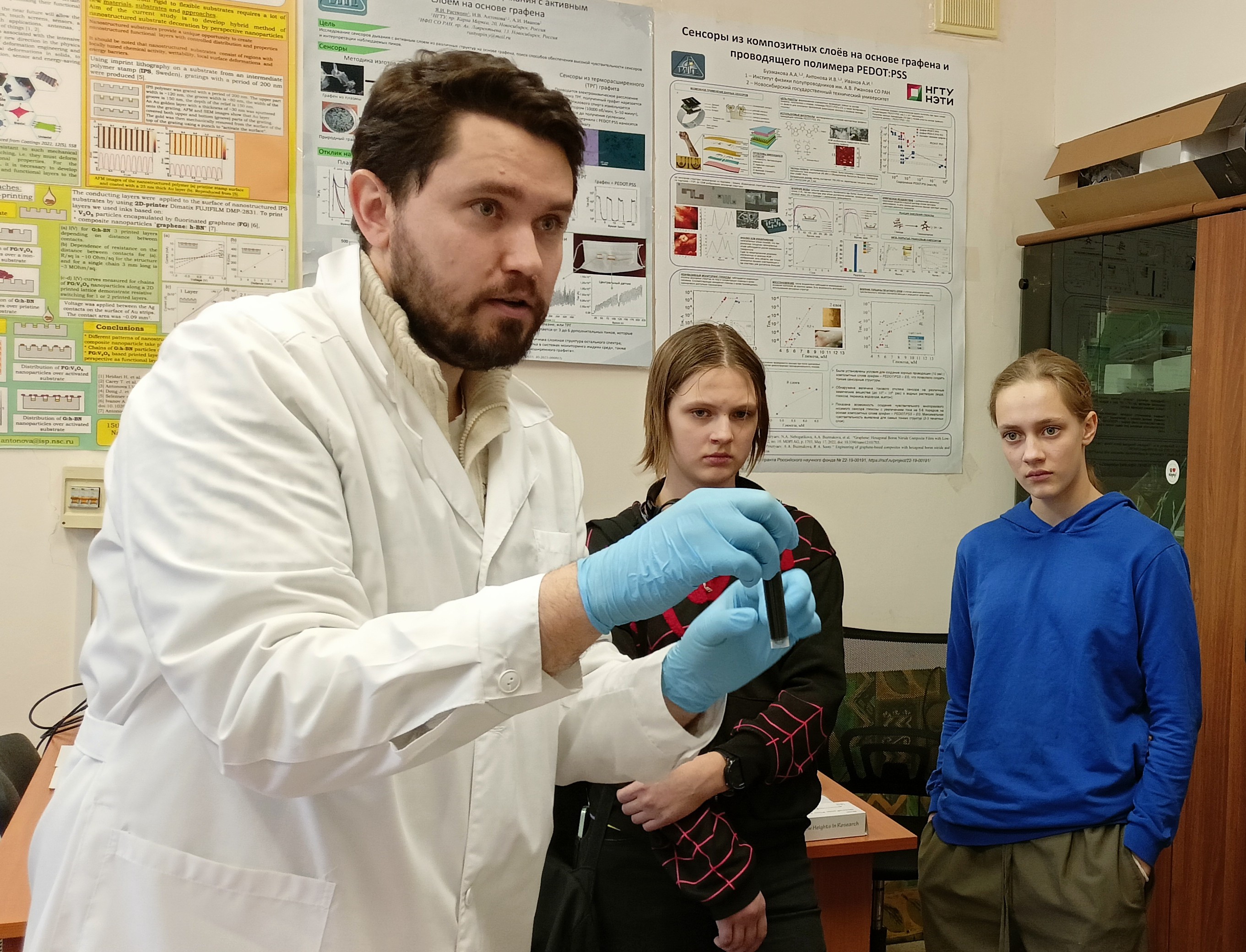 В лаборатории нанотехнологий и наноматериалов школьники увидели гибкие электронные компоненты. Их ученые напечатали на специальном принтере, заправив его композитными графеновыми чернилами, разработанными научной группой ИФП СО РАН.