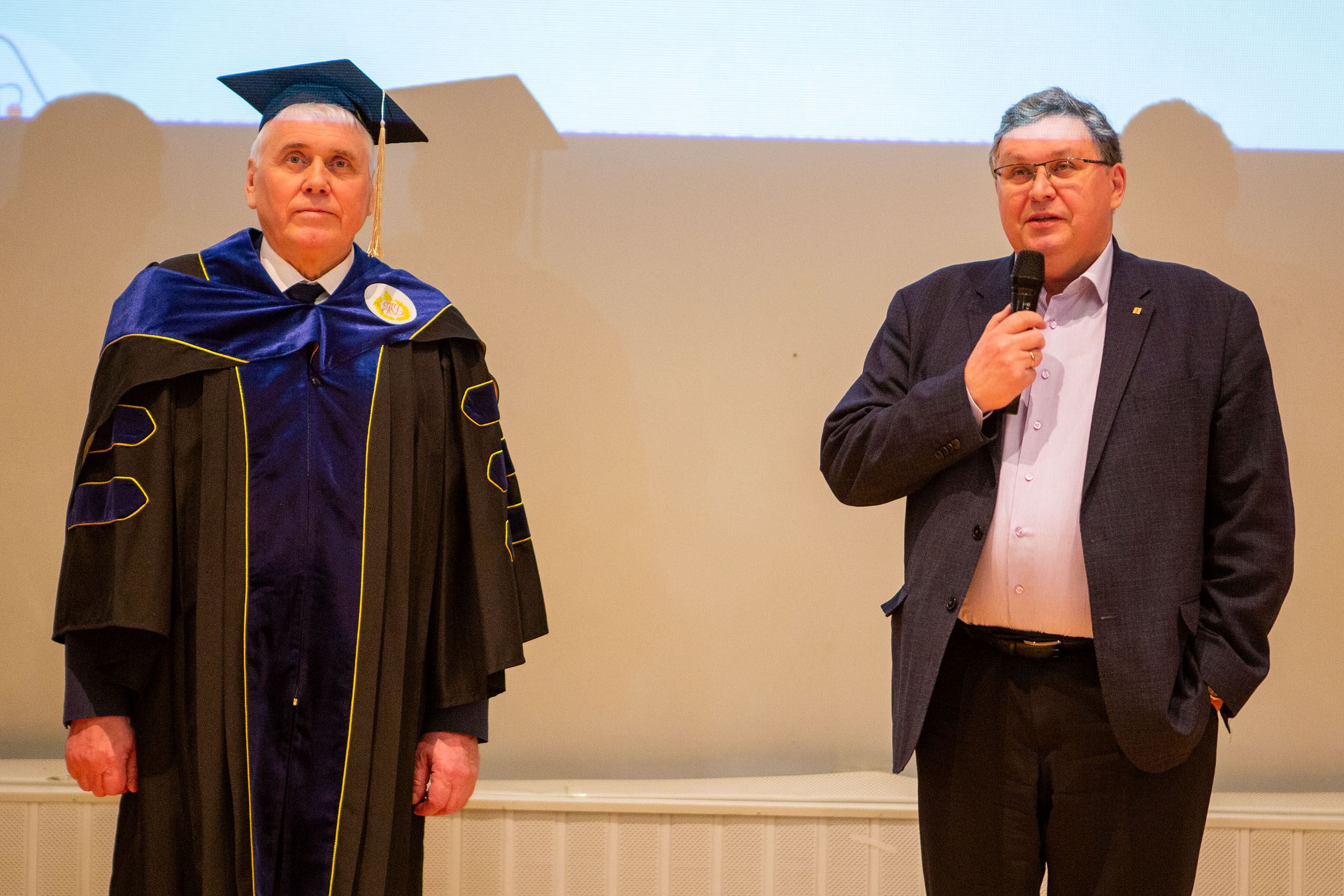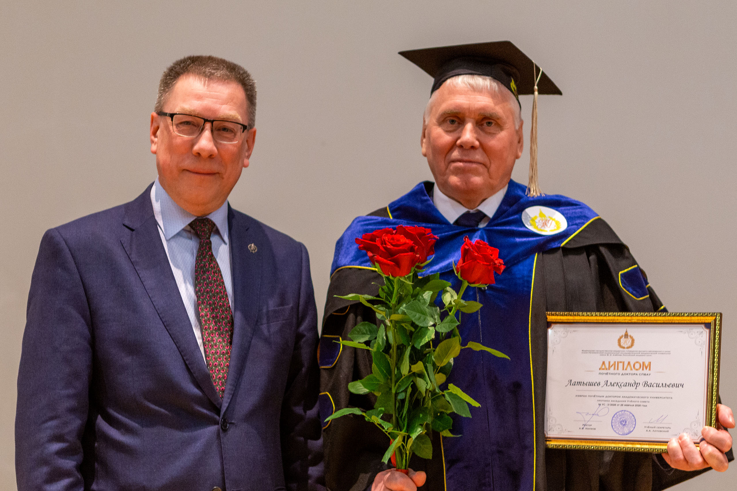 Александр Наумов зачитал решение Ученого совета, и Александру Латышеву были вручены мантия и диплом Почетного доктора.